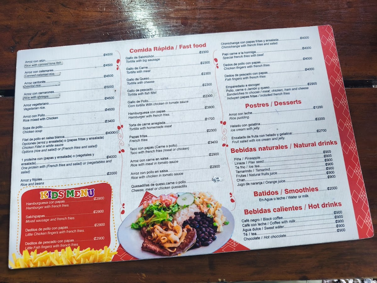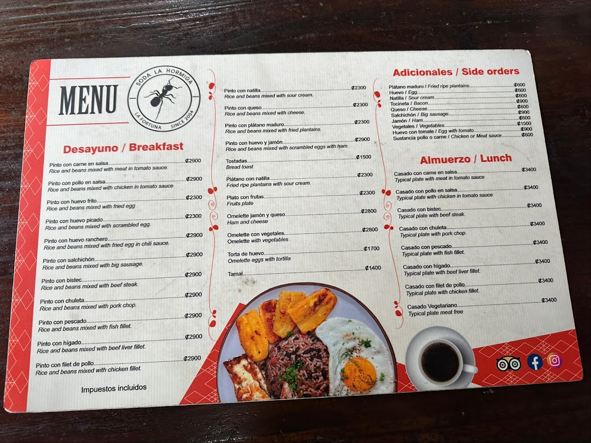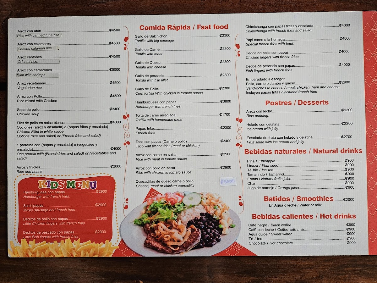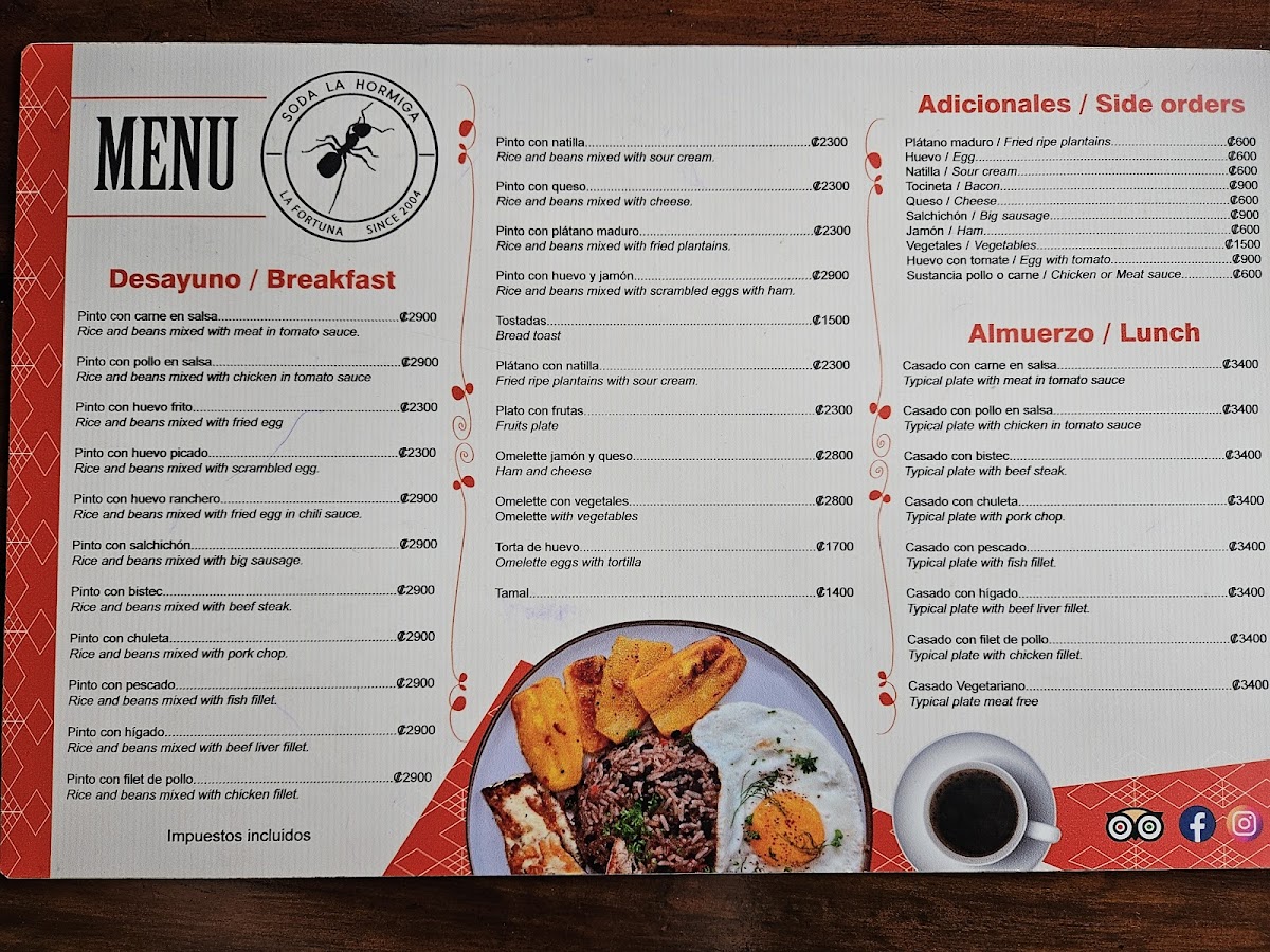 If you're ever in La Fortuna, Costa Rica, and find yourself near Mega Super, make sure to stop by Soda La Hormiga. Nestled in the heart of the city, this cozy spot is a local favorite, serving up delicious, authentic Costa Rican dishes. Whether you're craving a hearty casado, a refreshing ceviche, or some perfectly seasoned gallo pinto, the menu here has something for everyone. The atmosphere is laid-back, with a friendly vibe that welcomes both tourists and locals alike. As you explore the variety of options, you’ll notice the flavors are as vibrant and rich as the country itself. The Soda La Hormiga Menu offers traditional tastes with a touch of warmth, making it the perfect place to fuel up during your adventure. It’s a great place to unwind, savor some tasty food, and enjoy a true slice of Costa Rican cuisine.