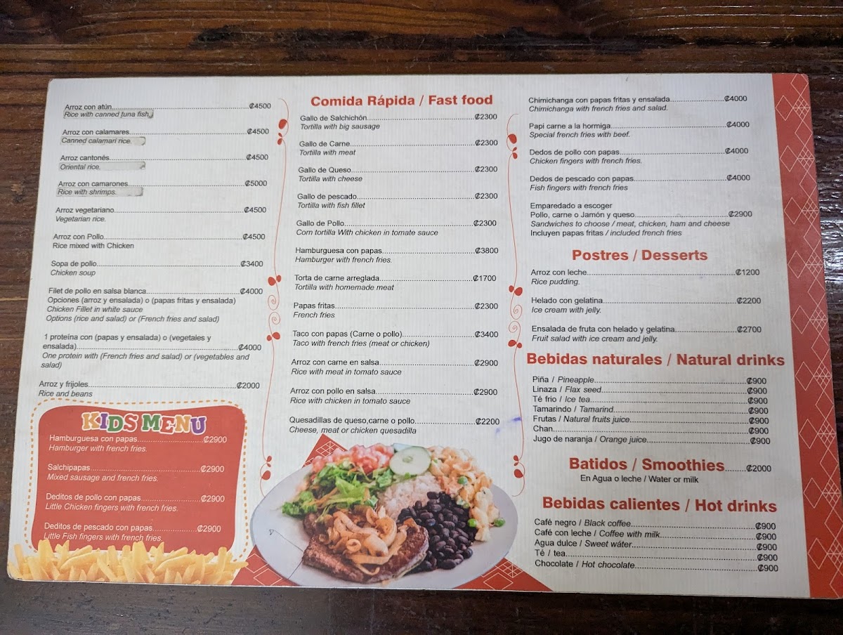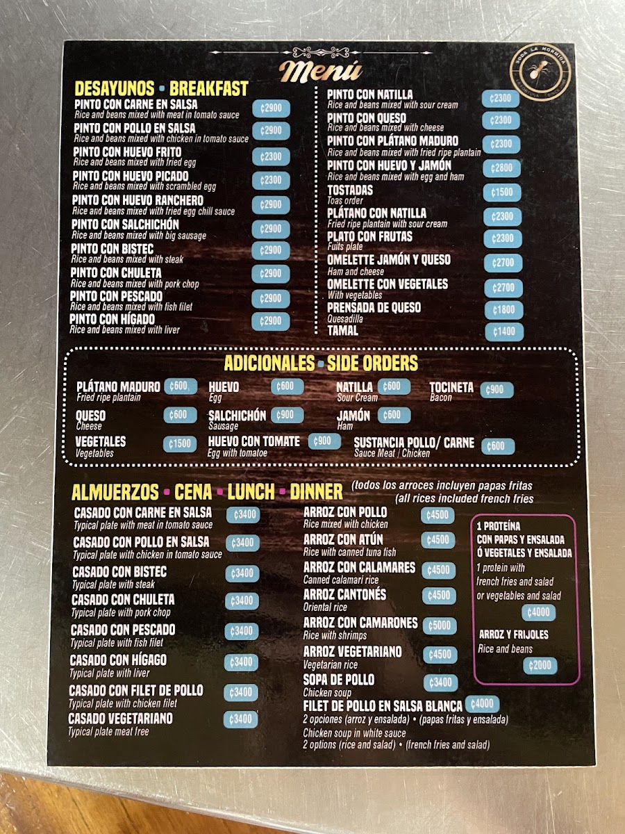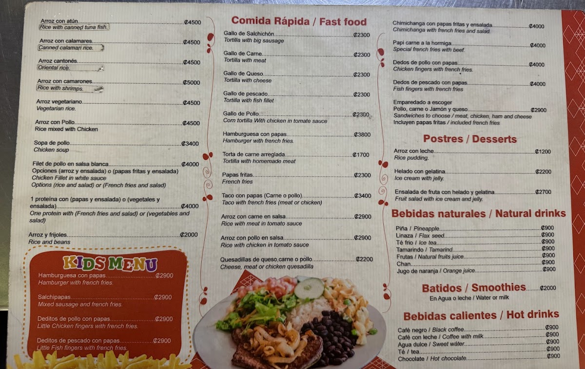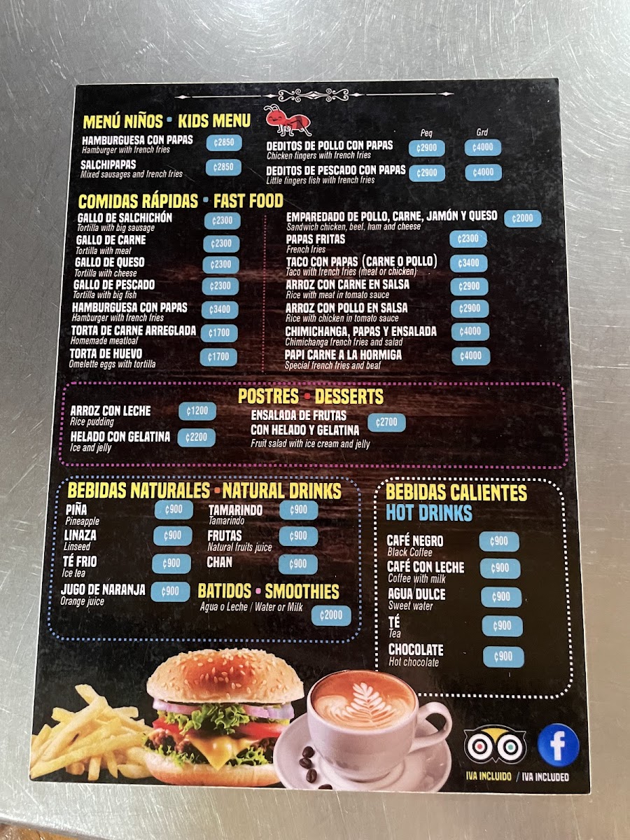 If you're ever in La Fortuna, Costa Rica, and find yourself near Mega Super, make sure to stop by Soda La Hormiga. Nestled in the heart of the city, this cozy spot is a local favorite, serving up delicious, authentic Costa Rican dishes. Whether you're craving a hearty casado, a refreshing ceviche, or some perfectly seasoned gallo pinto, the menu here has something for everyone. The atmosphere is laid-back, with a friendly vibe that welcomes both tourists and locals alike. As you explore the variety of options, you’ll notice the flavors are as vibrant and rich as the country itself. The Soda La Hormiga Menu offers traditional tastes with a touch of warmth, making it the perfect place to fuel up during your adventure. It’s a great place to unwind, savor some tasty food, and enjoy a true slice of Costa Rican cuisine.